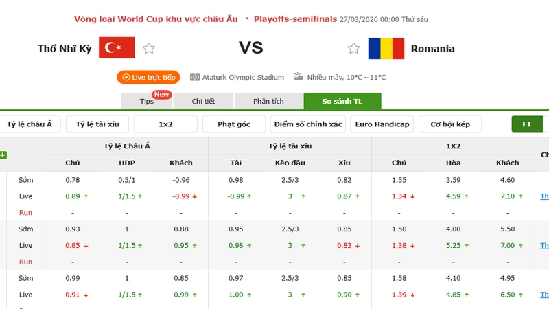 Bảng tỷ lệ kèo trận Thổ Nhĩ Kỳ vs Romania