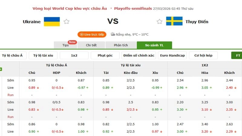 Bảng tỷ lệ kèo trận Ukraine vs Thụy Điển